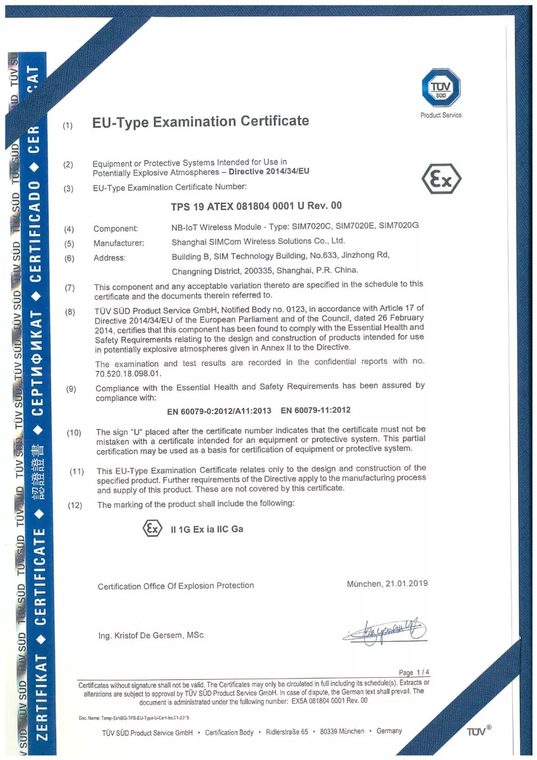 获得上述证书及CE标志表明SIM7020系列产品已满足欧盟用于潜在爆炸性环境的设备应用的技术要求――包括基本健康要求、安全要求和设备在其使用范围内投放到欧洲市场前必须采用的合格评定程序。